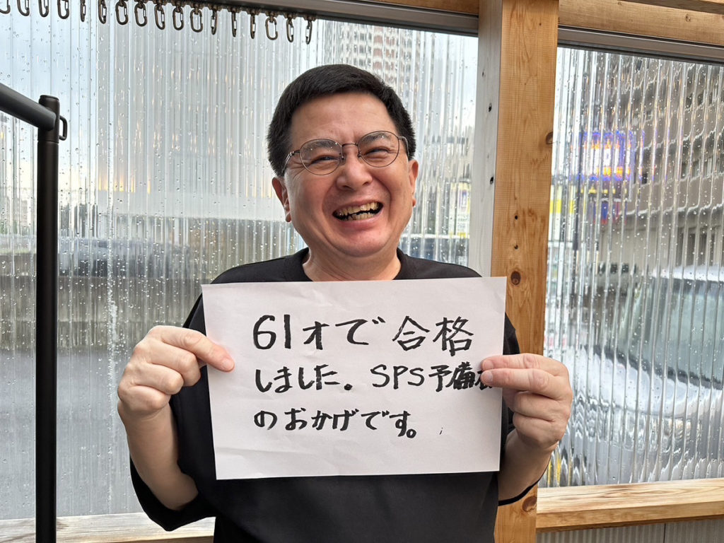 61歳5ヶ月、2回目の挑戦で何とか合格することが出来ました。受験勉強は長期間なので、体調を崩したり、不安になったり色々な事が起きます。そういった時、思い出したのは柴田先生から教わった言葉「言葉を発すれば成就する」でした。出来る出来る必ず出来ると自分に言い聞かせました。受験生の皆さん、今は辛い時期ですが、自分は絶対来年合格すると自分に言い聞かせ下さい。絶対合格できます。SPS予備校の先生方には大変お世話になりました。有り難うございました。